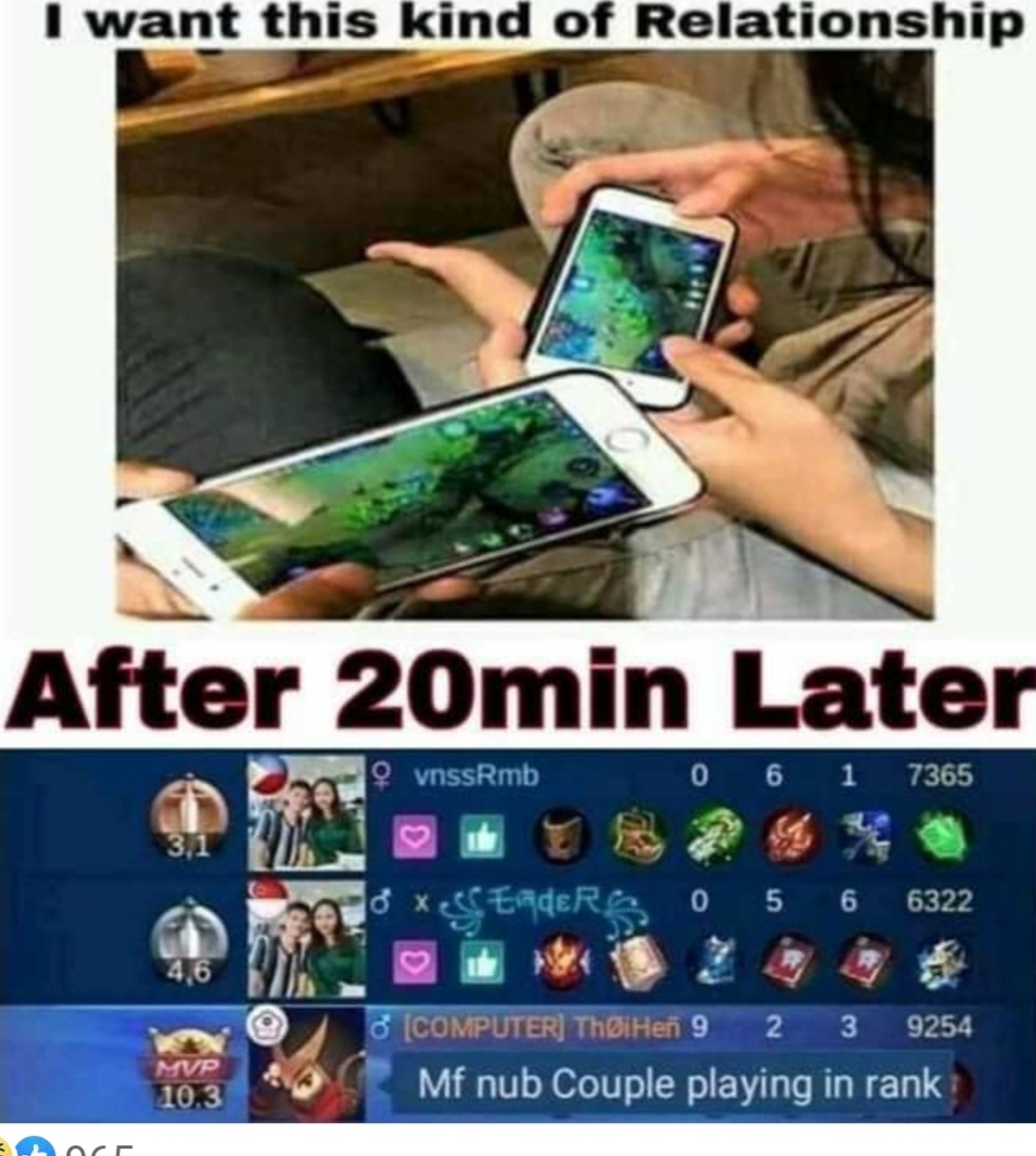 Relationship goal in Mobile Legends ML MEMES262 Views2 Likes 0 Comments Don't Miss: 1 When Smurf met SmurfDecember 6, 2020 1 Types of HeadachesFebruary 16, 2021 0 Literally the MMAugust 25, 2020LEAVE YOUR COMMENT Cancel replyYou must be logged in to post a comment.